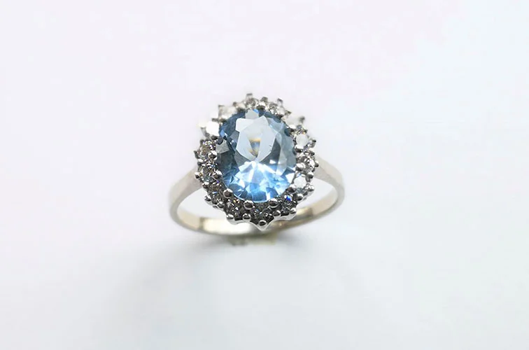 Váha prstenu je 4,2 g. Centrální kámen může být přírodní nebo syntetický tmavě modrý safír jako jej měla princezna Diana, světle modrý aquamarín, fialový ametyst, žlutý citrín, zelený Olivín nebo tmavě zelený smaragd, Ryzost zlata 14 kt 585/1000. Kvalita diamantu SI 1/G. Kvalita LG diamantu VS/E.