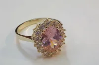 Luxusní zlatý zásnubní prsten London s výrazným oválným kamenem o rozměru 15x13 mm a 14 drobnějšími 2 mm zirkony.