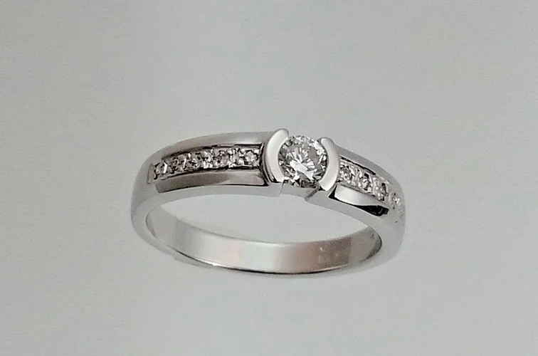 Váha prstenu 5 g. Ryzost zlata 14 kt 585/1000. Kvalita diamantu SI 1/G. Kvalita LG diamantu VS/E.